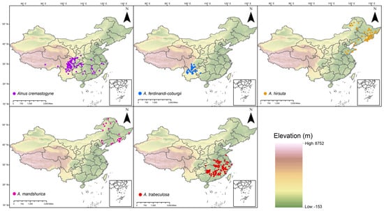 Distribution map of five Alnus species in China. Dots indicate the distribution of species.