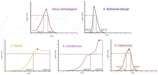 Response curves of temperature seasonality (bio04) affecting the distribution of five Alnus species. The range of logistics greater than 0.5 has been shown in figure.