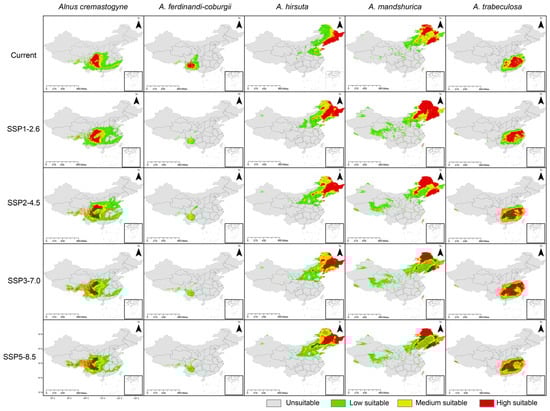 Potential suitable distributions map of five Alnus species under the current climate and four future climate scenarios (SSP1-2.6, SSP2-4.5, SSP3-7.0, and SSP5-8.5). Suitability levels are represented by different colors: gray for unsuitable ranges, green for low suitability, yellow for medium suitability, and red for high suitability.