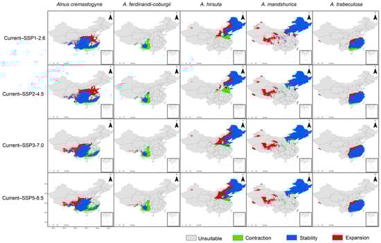 Distribution changes of five Alnus species from the current climate to four future climate scenarios (SSP1-2.6, SSP2-4.5, SSP3-7.0, and SSP5-8.5). Gray represents unsuitable ranges, green indicates contraction ranges, blue represents stable ranges, and red indicates expansion ranges.