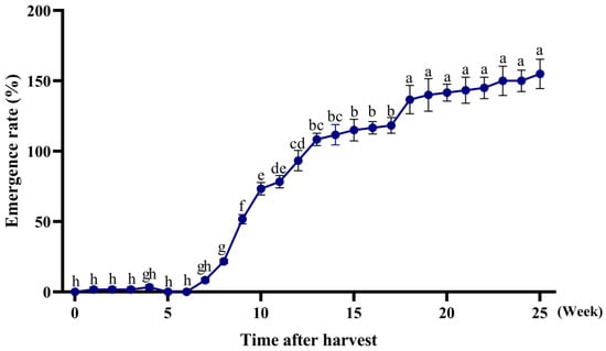 A. tauschii as a major and persistent weed in wheat fields. However, conducting experiments with seeds stored at room temperature does not provide an accurate representation of the actual dormancy patterns observed in the field. The results presented in this paper can be regarded as a simulation experiment and serve as a reference for understanding dormancy behavior under field conditions. In our future efforts, we aim to improve the storage conditions of the seeds to closely mimic those encountered in the field. The ability of weed seeds to emerge under varying environmental conditions is a critical determinant of their survival, colonization, and subsequent spread. Previous research has demonstrated that seedling emergence depends heavily on seed reserves, which are often insufficient to support germination when buried in deeper soil layers [