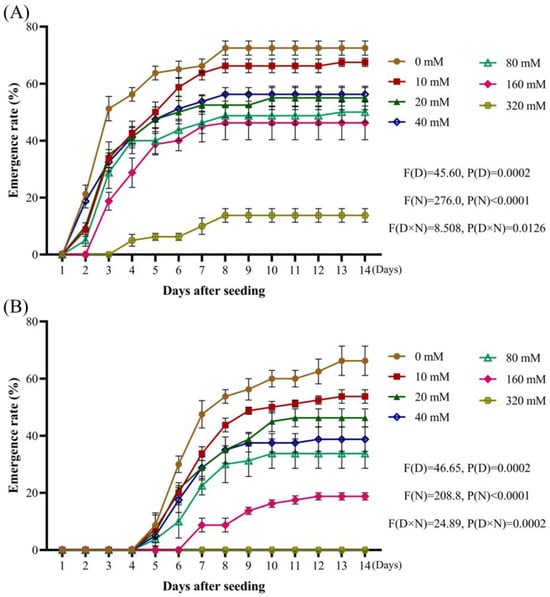 A. tauschii seeds exhibit moderate salt tolerance. When the osmotic potential ranged between −0.4 MPa and −0.1 MPa, the seed emergence rates were significantly enhanced. However, at an osmotic potential of −0.5 MPa and −0.6 MPa, seedling emergence was inhibited, although there was no significant suppression of radicle sprouting, and it was even enhanced in some cases. These findings suggest that mild drought stress conditions can promote the emergence of