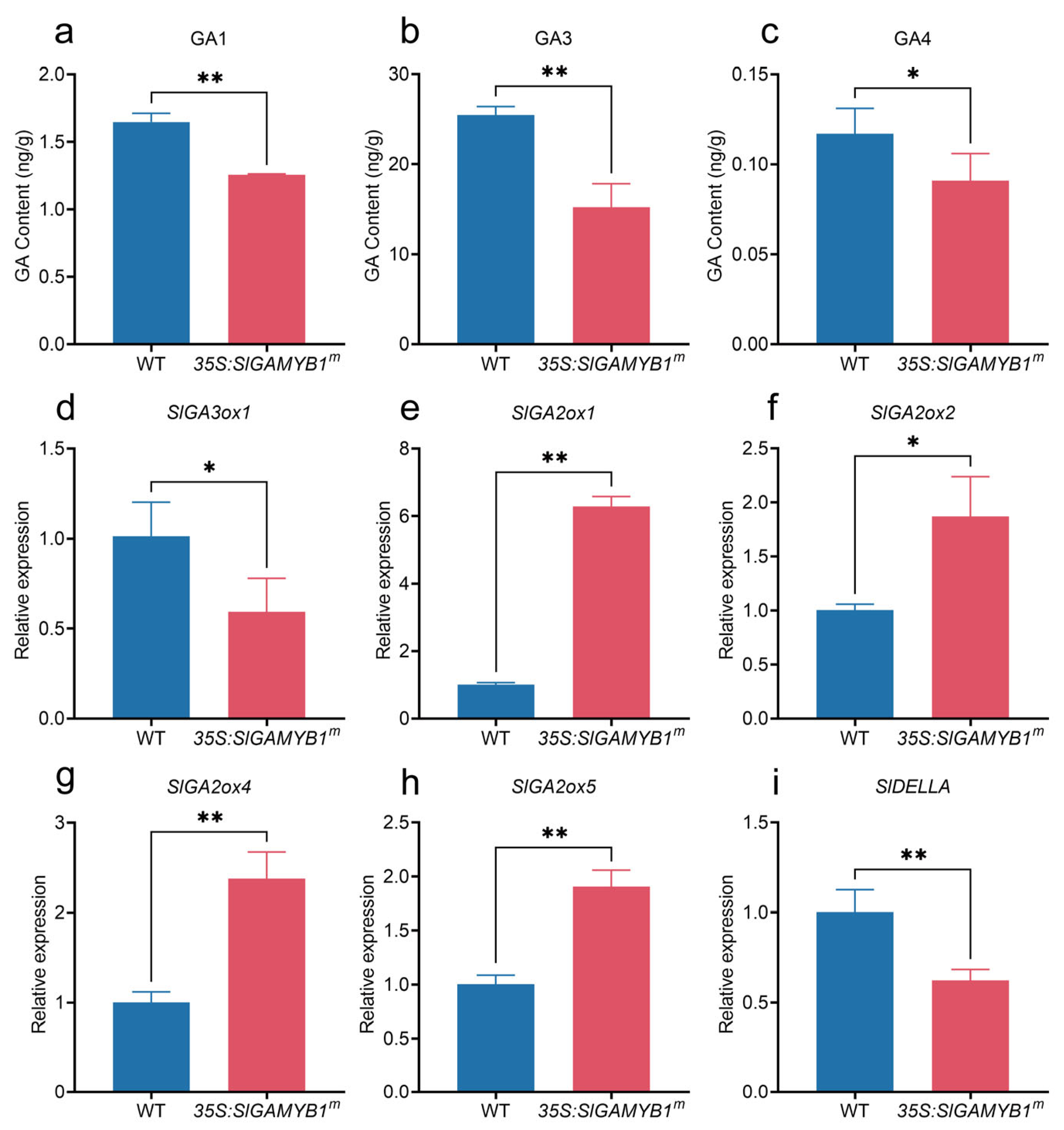 2.2. Overexpression of SlGAMYB1 Results in Plant Dwarfism via GA Deficiency in Tomato