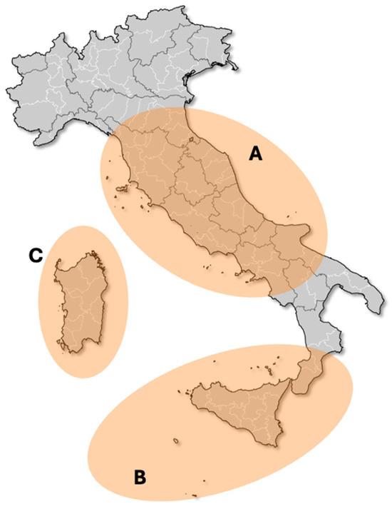 Study areas, namely the three macro-archipelagos discussed in the present study: (A) Peninsular Italian archipelago, referred to as circum-Italian; (B) Sicily archipelago, referred to as circum-Sicilian; (C) Sardinian archipelago, referred to as circum-Sardinian.
