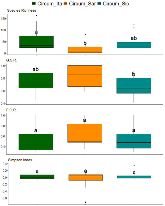 Boxplot representing species richness, G.S.R (genera-to-species ratio), F.G.R. (family-to-genera ratio) and the area-corrected Simpson index of the studied archipelagos. The statistical significance of differences is reported by letters above the boxes. Different letters indicate the statistical significance of differences, while the same letter indicates the absence of any statistically significant difference (differences are considered significant at p-value < 0.05). Different archipelagos are indicated by different colors as reported in the legend (Circum_Ita = circum-Italian islands; Circum_Sar = circum-Sardinian islands; Circum_Sic = circum-Sicilian islands).