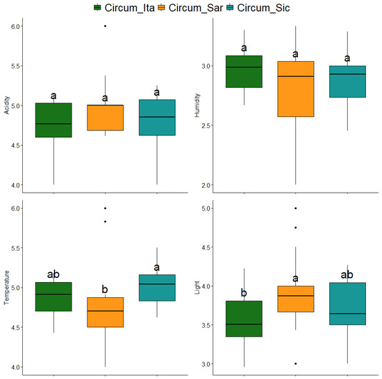 Boxplot representing the mean acidity, humidity, temperature and light requirements in the bryophytes inhabiting the studied archipelagos as described by Dierßen indicators. The statistical significance of differences is reported by letters above the boxes. Different letters indicate the statistical significance of differences, while the same letter indicates the absence of any statistically significant difference (differences are considered significant at p-value < 0.05). Different archipelagos are indicated by different colors as reported in the legend (Circum_Ita = circum-Italian islands; Circum_Sar = circum-Sardinian islands; Circum_Sic = circum-Sicilian islands).