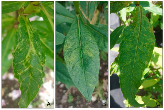 Virus-like symptoms on the leaves of the samples Px15, cultivar ‘Mirage’ (A) and Px31, cultivar ‘Regina’ (B) from the phlox cultivar collection of the Tsitsin Main Botanical Garden, and the sample PxBG2 of unknown cultivar (C) from the Botanical Garden of Lomonosov Moscow State University, Moscow, Russia.