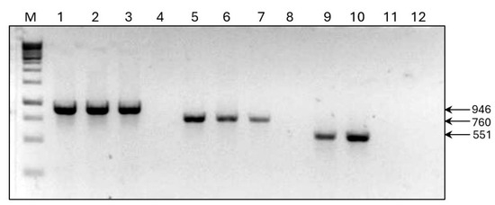 Agarose gel electrophoresis of amplicons obtained by RT-PCR assay of the samples Px15 (lanes 1, 5, 9), PxBG2 (lanes 2, 6, 10), Px31 (lanes 3, 7, 11), and negative control (uninfected plant, lanes 4, 8, 12) using virus-specific primers to tobacco streak virus (1–4), beet ringspot virus (5–8), and beet ringspot virus satellite RNA (9–12). M—GeneRuler 1 kb DNA ladder (Thermo Scientific, Waltham, MA, USA). The arrows to the right of the figure indicate PCR products of the corresponding size (bp).