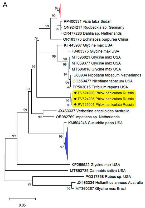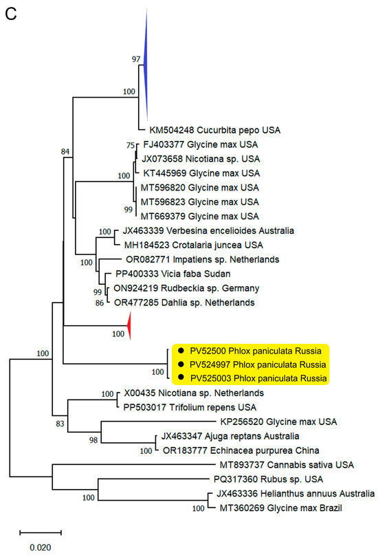 Maximum likelihood phylogenetic trees based on full-length sequences of tobacco streak virus (TSV) genome RNA1 (A), RNA2 (B), and RNA3 (C) using the GTR best-fit substitution model. The accession number, Latin name of the host plant, and geographical origin of the virus isolate are given at the end of branches. Russian phlox isolates are in yellow and marked with a black circle (●). Blue and red triangles denote condensed clusters represented with Indian isolates from different hosts and a group of US isolates from soybean, respectively. Bootstrap values from 1000 replicates (>75%) are shown next to the corresponding node. The scale bar indicates the number of nucleotide substitutions per site.