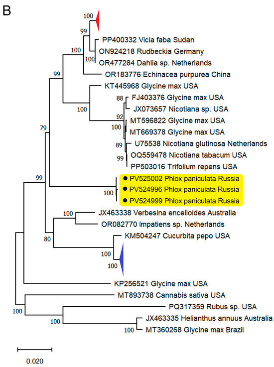 - Motsar, E.; Sharko, F.; Sheveleva, A.; Savostayanova, L.; Mitrofanova, I.; Chirkov, S. Complete genome and molecular characterization of spiranthes mosaic virus 3 from Phlox paniculata. Virus Genes 2025, 61, 381–385. [Google Scholar] [CrossRef] [PubMed]