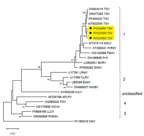 Phylogenetic analysis of tobacco streak virus (TSV) isolates from phlox and selected members of the genus Ilarvirus based on the alignment of the complete amino acid sequences of the coat protein. The tree was reconstructed in MEGA X using the maximum likelihood method with the WAG best-fit substitution model. Bootstrap values (>85%) from 1000 replicates are shown next to the corresponding nodes. The accession numbers in GenBank and virus acronyms are shown at the end of branches. Brackets combine isolates of the same subgroup. The scale bar indicates the number of substitutions per nucleotide. The phlox TSV isolates are highlighted with yellow and a black circle (•). Cucumber mosaic virus (CMV) was used as an outgroup. Viruses used for tree reconstruction are (subgroup 1) AGLV—ageratum latent virus, BCRV—blackberry chlorotic ringspot virus, PMoV—parietaria mottle virus, PrRSV—privet ringspot virus, PrVI—prunus virus I, and SNSV—strawberry necrotic shock virus; (subgroup 2) CLRV—citrus leaf rugose virus, EMoV—elm mottle virus, HdVBV—hydrangea vein banding virus, LRMV—lilac ring mottle virus; (subgroup 3) LLCV—lilac leaf chlorosis virus, PNRSV—prunus necrotic ringspot virus; (subgroup 4) PDV—prune dwarf virus, WCVA—water chestnut virus A; (unclassified) APLPV—American plum line pattern virus, and HJLV—humulus japonicus latent virus.