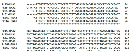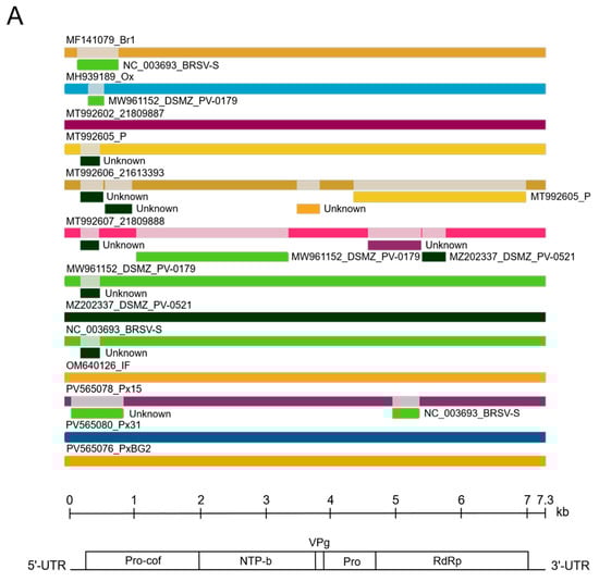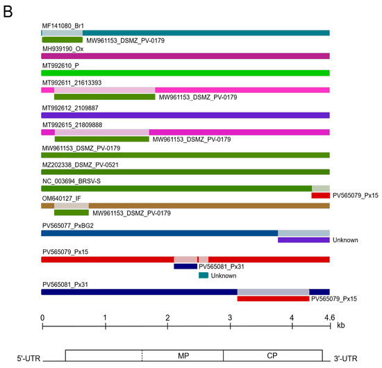 In each sample, 35–50 million pair-ended reads of 150 bp length were generated, from which 10–45 thousand contigs were assembled (Table S1). TSV- and BRSV-related contigs, covering almost the entire genome of these viruses, were identified in all three samples using NCBI BLAST v.2.15.0. Contigs related to BRSV satRNA were also assembled in the Px15 and PxBG2 samples. The depth of coverage ranged from 14× to 114× for BRSV, 13× to 208× for BRSV satRNA, and 192× to 4483× for TSV-related contigs. The raw pair-ended reads were deposited in the NCBI Sequence Read Archive (https://www.ncbi.nlm.nih.gov/sra/PRJNA1244124, accessed on 31 March 2025).