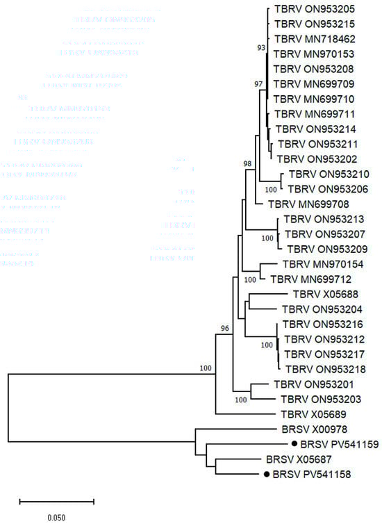 For analysis of the newly assembled TSV, BRSV, and BRSV satRNA sequences, full-length genomes of other isolates of these viruses were retrieved from GenBank. Multiple sequence alignment was performed using the ClustalW algorithm implemented in the MegAlign DNASTAR Lasergene software package (version 15) [33]. The resulting alignments were used to calculate nucleotide and amino acid sequence identities between viral isolates and for phylogenetic analyses conducted in MEGA X [34]. Phylogenetic trees were reconstructed using the maximum likelihood method, with the GTR model for nucleotide-based trees and the WAG model for amino acid-based trees, selected as the best-fit substitution models. ORFs in the viral genomes were identified using the ORF Finder program (https://ncbi.nlm.nih.gov/orffinder, accessed on 29 October 2024). Conserved protein domains were identified using the Conserved Domain Database (CDD, https://ncbi.nlm.nih.gov/Structure/cdd/wrpsb.cgi, accessed on 29 October 2024). Potential recombination events in TSV and BRSV genomes were analyzed using RDP v.4.101 [29] with the default settings except that “sequences are linear” and “list events detected by >6 methods” options were chosen.