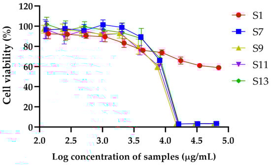 Dose-dependent cytotoxic effects of DESs extracts on cell viability. Graph illustrates percentage of cell viability following treatment with increasing log concentrations of S1, S7, S9, S11, and S13. Data are expressed as mean ± standard deviation (SD) of three independent experiments.