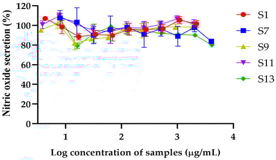 Percentage of nitric oxide secretion in response to varying log concentrations of S1, S7, S9, S11, and S13. Data are presented as mean ± standard deviation (SD) from three independent experiments.