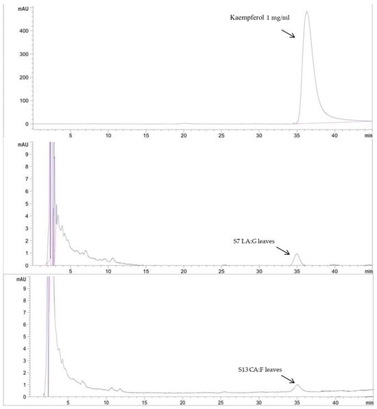 HPLC chromatogram of kaempferol standard and kaempferol content in selected DESs extracts.