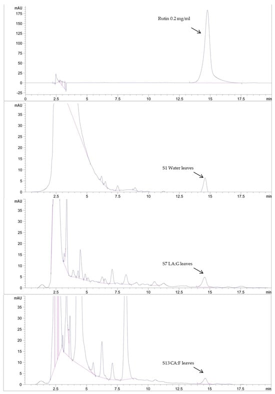 HPLC chromatogram of rutin standard and rutin content in selected DESs extracts.