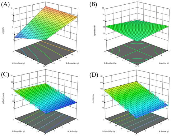 Response surface diagrams (RSD) illustrating interaction effects of independent variables influencing formulation viscosity (A), spreadability (B), cohesiveness (C), and consistency (D).