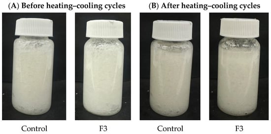 Physical appearances of control and F3 formulation before (A) and after (B) heating–cooling cycles test.