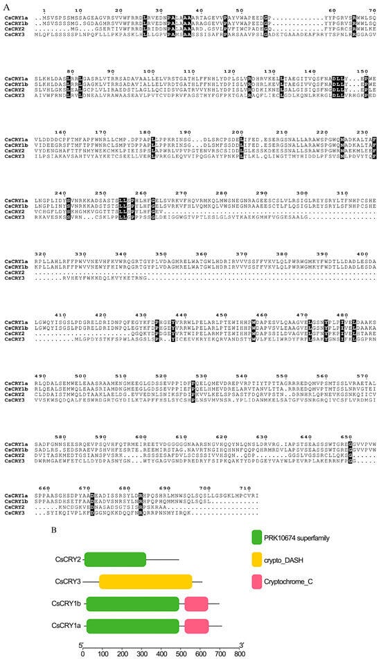 Using MEGA v11 software, the sequence alignment of the four CRYs proteins was performed to construct their evolutionary relationships. CsCRY1a and CsCRY1b showed the highest similarity at 34.21% similarity, while CsCRY2 and CsCRY3 had a similarity of 21.48%. The four CsCRYs protein sequences share only 72 common amino acids. The structural domain analysis of the four CsCRYs proteins using ESPript 3 revealed that CsCRY1b and CsCRY1a have identical domains, both possessing the PRK10674 superfamily and Cryptochrome C domains (Figure 1B), as well as the photolyase homology region (PHR) domain and the C-terminal extension domain. CsCRY2 only contains the PRK10674 superfamily domain, while CsCRY3 only has the crypto_DASH domain, showing significant differences.