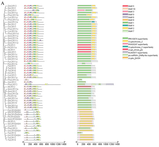 To further explore the similarities and differences between the CsCRYs gene family and other species, the conserved motifs of the CRY gene family in the four CsCRYs genes and several species were compared and analyzed (Figure 2A). A total of 59 gene sequences, distinguished by 10 conserved motifs (Motif 1–Motif 10), were examined using the online software MEME for the CRY gene families in the four CsCRYs genes and other species. The results showed that each CRY gene contains 1 to 10 motifs. An analysis of this result in conjunction with Figure 2A,C shows that CsCRY1a and CsCRY1b have the same motif and both consist of two structural domains; Motifs 3, 5, 6, 9, and 10 form the PRK10674-Superfamily structural domain, which is related to signaling; and the rest, Motifs 1, 2, 7, and 8, form the Cryptochrome-C structural domain, which is related to photosynthetic signaling and interaction with downstream signals, and is similar to other species such as wheat, sorghum, and maize, which also consist of these two structural domains in their CRY1 sequences and have the same motif composition, which can be regarded as a strong evidence for the identification of CRY1. Interestingly, Phyllostachys edulis PheCRY1a, which is very close to Ch.sichuanensis, lacks Motifs 3, 5, and 10, which suggests that there are differences in their sequence compositions despite having the same structural domains, and CsCRY2 is similar to CRY2 genes of other species in that it possesses a PRK10674-Superfamily structural domain, which is not of the same length in different species. CsCRY2 consists of Motifs 2, 3, 5, 7, 9, and 10, with Motif 8 missing compared to wheat, sorghum, and maize, and this fragment is not found in Phyllostachys edulis (Figure 2A). CRY3 is more consistent in all species and consists of the Crypto-DASH structural domain, which is a marker for identifying CRY3 and consists of Motifs 1, 2, 4, 5, and 6, which is present in both CsCRY3 and AtCRY3 and ZmCRY3.