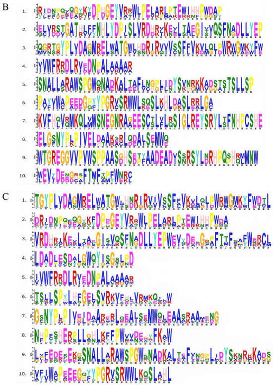 Among them, some motifs are common to all members, such as Motif 5 (except TaCRY3, PpCRY1b, and ZmCRY1), and CRY gene family members of most species contain Motif 1, Motif 2, Motif 3, Motif 4, Motif 5, and Motif 10. The results indicate that they are CRY gene family members and Motifs 3, 5, 6, 9, and 10 constitute the PRK10674 conserved domain, Motifs 1, 2, 4, 7, and 8 constitute the Cryptochrome_C conserved domain, and Motifs 1, 2, 4, and 6 constitute the Cryptochrome_DASH domain (Figure 2A,B). The above results indicate that there are both similarities and differences in the functions of CRY genes among different subfamilies.