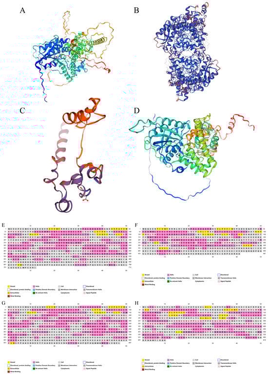 Protein structure prediction of CsCRYs family members in Chimonobambusa sichuanensis. Note: (A) Predicted secondary structure of CsCRY1a protein; (B) predicted secondary structure of CsCRY1b protein; (C): predicted secondary structure of CsCRY2 protein diagram; (D) CsCRY3 protein secondary structure prediction diagram; (E) predicted 3D structure of CsCRY1a protein, which is based on the construction of a corn CRY1 gene model with a matching similarity degree of 88.97%, gene number LOC100384475; (F) predicted 3D structure of CsCRY1b protein, which is based on the construction of a corn CRY1 gene model with a matching similarity of 82.01%, gene number LOC100384475; (G) predicted 3D structure of CsCRY2 protein, based on a maize OsCRY2 gene model construct with a matching similarity of 80.37%, number J013042O16; and (H) predicted 3D structure of CsCRY3 protein, which is based on the construction of the OsCRY3-DASH gene model of Japonicoideae with a matching similarity of 88.79%, number Q651U1.