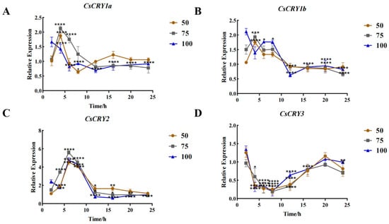 Gene expression of Chimonobambusa sichuanensis CsCRYs family members under different blue-light treatments. Note: (A) CsCRY1a gene expression; (B) CsCRY1b gene expression; (C) CsCRY2 gene expression; and (D) CsCRY3 gene expression. Data were normalized by qRT-PCR to the expression level of each gene at 3 h. Values are expressed as mean ± SD. Statistically significant differences were analyzed using two-way ANOVA (* p < 0.05, ** p < 0.01, *** p < 0.001, and **** p < 0.0001).