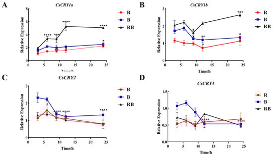 Gene expression of Chimonobambusa sichuanensis CsCRYs family members under different light quality treatments. Note: (A) CsCRY1a gene expression; (B) CsCRY1b gene expression; (C) CsCRY2 gene expression; and (D) CsCRY3 gene expression. Data were normalized by qRT-PCR to the expression level of each gene at 3 h. Values are expressed as mean ± SD. Statistically significant differences were analyzed using two-way ANOVA (* p < 0.05, ** p < 0.01, *** p < 0.001, and **** p < 0.0001).