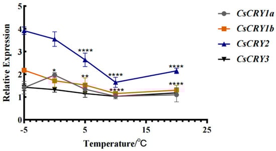 Gene expression of Chimonobambusa sichuanensis CsCRYs family members under different temperature treatments. Note: Data were normalized by qRT-PCR to the expression level of each gene at −5 °C. Values are expressed as mean ± SD. Statistically significant differences were analyzed using two-way ANOVA (* p < 0.05, ** p < 0.01, and **** p < 0.0001).