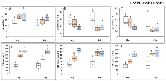 Box plots showing physiological traits of P. rotundum var. subintegrum measured in May and July under three climate scenarios (SSP1, SSP3, SSP5). (A) Net photosynthetic rate(A), (B) stomatal transpiration rate (E), (C) stomatal conductance (gs), (D) intercellular CO2 concentration (Ci), (E) instantaneous transpiration efficiency (ITE), and (F) intrinsic water-use efficiency (WUEi). Measurements reflect the plant’s photosynthetic response and water regulation under elevated CO₂ and temperature. Different letters indicate statistically significant differences among treatments based on Tukey’s HSD test (p < 0.05).