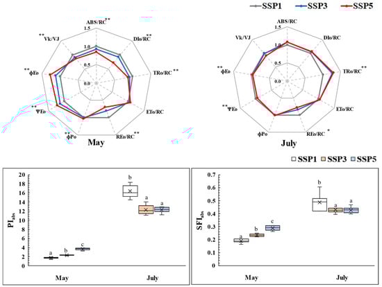 Spider plots comparing chlorophyll fluorescence parameters and photosynthetic vitality indices of P. rotundum var. subintegrum under three SSP scenarios in May and July. Parameters include energy absorption (ABS/RC), dissipation (DIo/RC), electron transport (ET0/RC, REo/RC), trapping efficiency (TRo/RC), and quantum yields (ΦPo, ΦEo, ΨEo). Higher values indicate stronger photosynthetic activity. Data are normalized to SSP1 for comparison. Asterisks and letters indicate significant differences (Tukey’s HSD: * p < 0.05, ** p < 0.001).