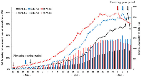 Temporal changes in the relative flowering rate (line graph) and the cumulative bloom quantity (bar graph) of P. rotundum var. subintegrum under three climate change scenarios (SSP1, SSP3, SSP5) from late June to early August. Flowering onset occurred earlier under higher-emission scenarios, with SSP5 initiating on 21 June compared to 28 June under SSP1. The peak flowering dates were also advanced by up to 4 days under SSP5. These shifts suggest that elevated CO2 and temperature accelerate floral development and flowering synchrony.
