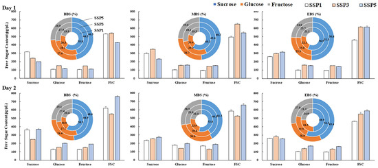 During the MBS, SSP1 and SSP5 maintained elevated sugar contents on day 2 compared to those on day 1, whereas SSP3 exhibited no significant change, reflecting a trend similar to that in the early flowering stage.