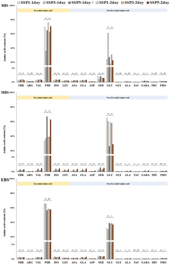In the late flowering stage (EBS), phenylalanine (58.3–66.8%) and glutamine (33.2–41.7%) remained the predominant amino acids, with essential amino acids consistently exceeding non-essential amino acids by 1.4–2.1 times across all treatments. In SSP5, the phenylalanine levels on day 1 were slightly lower (58.3%), with higher glutamine levels (41.7%), but their composition had nearly stabilized on day 2. Although the same 17 amino acids were consistently detected across all flowering stages, their compositional ratios exhibited slight variations (Figure 5).