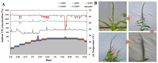 Moreover, flowering characteristics such as the inflorescence length and width, number of inflorescences per plant, and number of flowers per inflorescence increased significantly with elevated climate change scenario levels, except for inflorescence width (p < 0.05), mirroring the trend observed for aboveground biomass accumulation. Early-spring flowering plants generally require vernalization, wherein exposure to low winter temperatures promotes flowering. In such cases, winter warming could paradoxically reduce flowering [40]. However, P. rotundum var. subintegrum is a day-neutral plant with no vernalization requirements [41], and its summer flowering suggests that temperature and CO2 conditions directly influence the flowering traits throughout its growth period. Notably, P. rotundum var. subintegrum has an indeterminate inflorescence, in which flowers continue to develop at the apex while flowering progresses from the lower part of the inflorescence [42]. Consequently, inflorescence length can be highly responsive to the growth conditions during the flowering period.