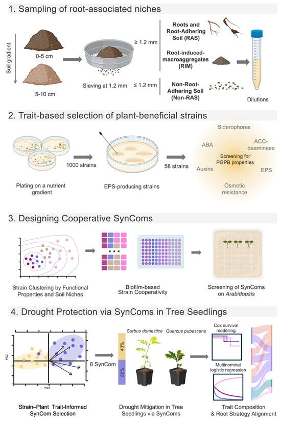 Aleksieienko I, Fernandes Hertel M, Reilhan J, de Castro M, Légeret B, Caixeta Oliveira H, Reiter IM, Santaella C. Soil-Gradient-Derived Bacterial Synthetic Communities Enhance Drought Tolerance in Quercus pubescens and Sorbus domestica Seedlings. Plants. 2025; 14(11):1659. https://doi.org/10.3390/plants14111659
