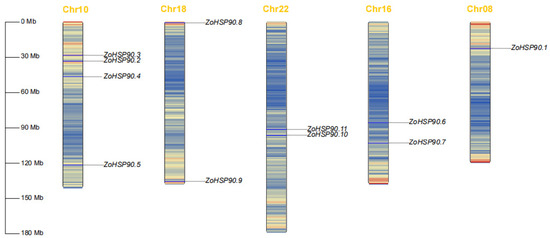 According to the genetic linkage map (Figure 1), the 11 HSP90 gene family members are distributed across five chromosomes. Specifically, ZoHSP90.3, ZoHSP90.2, ZoHSP90.4, and ZoHSP90.5 are located on chromosome 10, ZoHSP90.8 and ZoHSP90.9 are found on chromosome 18, ZoHSP90.10 and ZoHSP90.11 are situated on chromosome 22, ZoHSP90.6 and ZoHSP90.7 are located on chromosome 16, and ZoHSP90.1 is found on chromosome 8. This distribution suggests a non-random arrangement of HSP90 genes within the ginger genome, which may have implications for their functional interactions and evolutionary history.