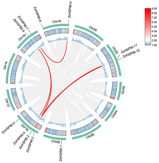 To further investigate the homologous relationships of the HSP90 gene family, a multi-species synteny analysis was conducted (Figure 2), selecting HSP90 family members from Musa acuminata (wild banana), Zingiber zerumbet (shampoo ginger), Oryza sativa (rice), and Arabidopsis thaliana (Arabidopsis) for comparison, alongside an intraspecies synteny analysis of the ginger HSP90 family (Figure 3). The interspecies synteny analysis revealed that four HSP90 members in Musa acuminata are directly homologous to nine HSP90 members in ginger, forming four pairs of orthologous relationships. Additionally, nine HSP90 members in Zingiber zerumbet are directly homologous to fourteen HSP90 members in ginger, resulting in six pairs of orthologous relationships. Furthermore, one HSP90 member in Oryza sativa is directly homologous to one HSP90 member in ginger, forming one pair of orthologous relationships. However, no direct homologous relationships were found between the HSP90 members of Arabidopsis thaliana and those in ginger. Five pairs of segmental duplication genes were detected by intraspecific collinearity analysis, involving eight Zo HSP90 genes. Among them, HSP90.7 is homologous to HSP90.9, and HSP90.6 is homologous to HSP90.4 and HSP90.2. In addition, HSP90.11 is homologous to HSP90.2, and HSP90.10 is homologous to HSP90.3.