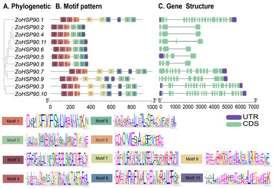 Conserved motifs and gene structures of the HSP90 gene family in ginger. (A) Maximum likelihood phylogenetic tree of ZoHSP90 proteins based on full-length amino acid sequences. (B) Distribution of ten conserved motifs identified by MEME analysis, with motif composition indicated by colored boxes (key in panel legend). (C) Exon-intron organization of ZoHSP90 genes. Green rectangles represent coding sequences (CDS), purple rectangles denote untranslated regions (UTRs), and connecting lines indicate introns.