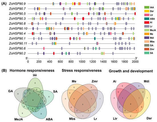 Cis-Regulatory Element Profiling of Ginger HSP90 Genes. (A) Distribution of cis-acting elements in ZoHSP90 promoters. IAA: auxin-responsive element; GA: gibberellin-responsive element; MeJA: MeJA-responsiveness; ABA: abscisic acid responsiveness; SA: salicylic acid responsiveness; Me: meristem expression; Zmr: zein metabolism regulation; Mbs: MYBHv1 binding site; Lr: light responsiveness; Ai: anaerobic induction; Mdi: (MYB) drought-inducibility; Dsr: defense and stress responsiveness; Ltr: low-temperature responsiveness. (B) Overlap analysis of stress-responsive cis-element classes among ZoHSP90 promoters.