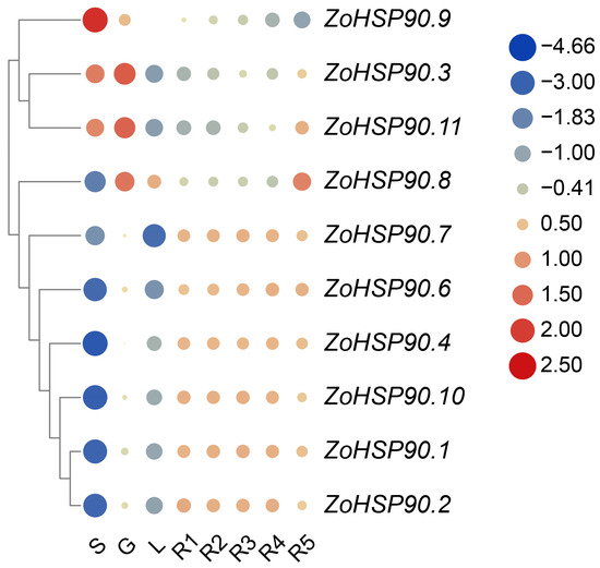 Gene expression heatmap of the ginger HSP90 gene family across different organs. Abbreviations: S denotes stem; G denotes root; L denotes leaves; R1 denotes primary rhizome buds; R2 denotes secondary rhizome buds; R3 denotes tertiary rhizome buds; R4 denotes fourth rhizome buds; R5 denotes fifth rhizome buds. The right column represents gene expression levels, with red coloring indicating upregulation, while blue denotes downregulation.