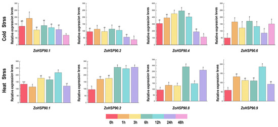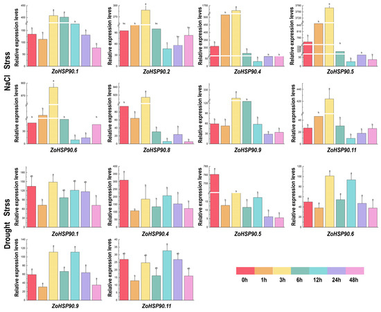 Based on RNA-seq data of stress-responsive genes, the expression patterns of ginger HSP90 genes under low-temperature, drought, high-temperature, and salt stress conditions exhibited significant differences (Figure 7). In low temperatures, ZoHSP90.4 reached its peak expression at 6 h, then gradually decreased, reaching its lowest expression level at 48 h. Additionally, ZoHSP90.1 displayed its maximum expression at 1 h. Under high-temperature conditions, expression levels of ZoHSP90.1 and ZoHSP90.9 peaked after 12 h of stress, then gradually decreased. Under drought stress conditions, ZoHSP90.5 exhibited minimal expression at 1 h, whereas ZoHSP90.6 and ZoHSP90.9 displayed a similar expression trend with higher levels at 3 and 12 h. Under salt stress conditions, ZoHSP90.4, ZoHSP90.5, ZoHSP90.6, ZoHSP90.8, and ZoHSP90.11 showed almost no expression after 3 h. This analysis indicates that different HSP90 genes in ginger respond distinctly to various environmental stressors, highlighting their potential roles in stress tolerance mechanisms.