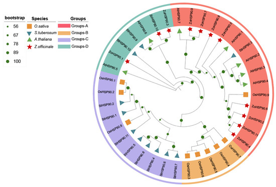 Phylogenetic tree based on the amino acid sequences of HSP90 proteins from O. sativa, S. tuberosum, A. thaliana, and Z. officinale. The bootstrap values are represented by the size of the green pie charts on the branches.