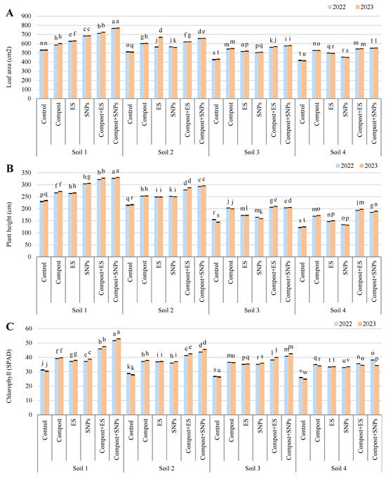 Variation in (A) leaf area, (B) plant height, and (C) chlorophyll (SPAD) content of maize plants (Zea mays L., cv Sakha 168) grown across different salinity levels—Soil 1 (EC = 3.68 dS/m), Soil 2 (EC = 6.15 dS/m), Soil 3 (EC = 8.34 dS/m), Soil 4 (EC = 12.18 dS/m)—and treated with different soil amendments (compost, elemental sulfur (ES), sulfur nanoparticles (SNPs), and their combinations) in two consecutive seasons (2022 and 2023). Different letters on bars are significant according to the Tukey’s test at p ≤ 0.05. Data are means ± SD. n = 3.