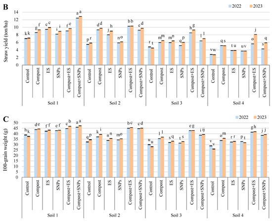 Variation in (A) grain yield, (B) straw yield, and (C) 100-grain weight of maize plants (Zea mays L., cv Sakha 168) grown across different salinity levels—Soil 1 (EC = 3.68 dS/m), Soil 2 (EC = 6.15 dS/m), Soil 3 (EC = 8.34 dS/m), Soil 4 (EC = 12.18 dS/m)—and treated with different soil amendments (compost, elemental sulfur (ES), sulfur nanoparticles (SNPs), and their combinations) in two consecutive seasons (2022 and 2023). Different letters on bars are significant according to the Tukey’s test at p ≤ 0.05. Data are means ± SD. n = 3.