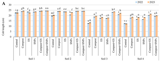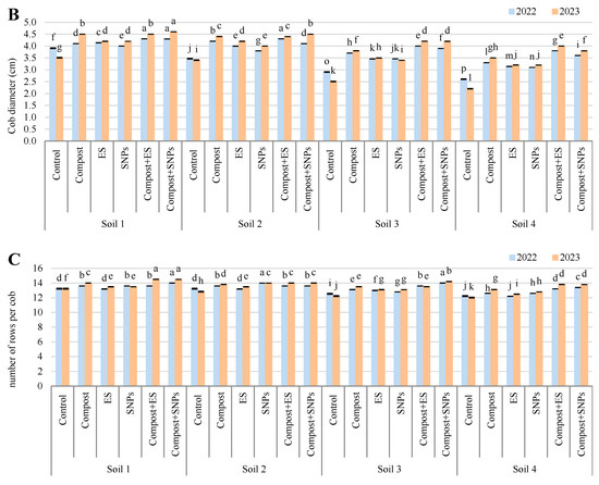 Variation in (A) cob length, (B) cob diameter, and (C) number of rows per cob of maize plants (Zea mays L., cv Sakha 168) grown across different salinity levels—Soil 1 (EC = 3.68 dS/m), Soil 2 (EC = 6.15 dS/m), Soil 3 (EC = 8.34 dS/m), Soil 4 (EC = 12.18 dS/m)—and treated with different soil amendments (compost, elemental sulfur (ES), sulfur nanoparticles (SNPs), and their combinations) in two consecutive seasons (2022 and 2023). Different letters on bars are significant according to the Tukey’s test at p ≤ 0.05. Data are means ± SD. n = 3.