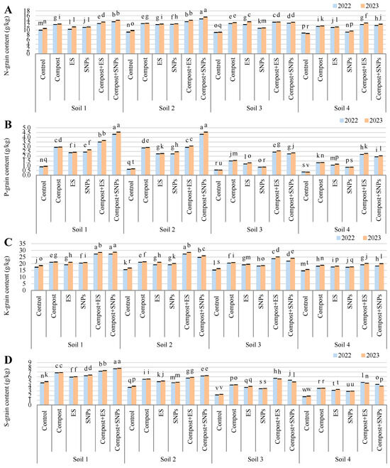 Variation in (A) nitrogen (N), (B) phosphorus (P), (C) potassium (K), and (D) sulfur (S) contents in grains of maize plants (Zea mays L., cv Sakha 168) grown across different salinity levels—Soil 1 (EC = 3.68 dS/m), Soil 2 (EC = 6.15 dS/m), Soil 3 (EC = 8.34 dS/m), Soil 4 (EC = 12.18 dS/m)—and treated with different soil amendments (compost, elemental sulfur (ES), sulfur nanoparticles (SNPs), and their combinations) in two consecutive seasons (2022 and 2023). Different letters on bars are significant according to the Tukey’s test at p ≤ 0.05. Data are means ± SD. n = 3.