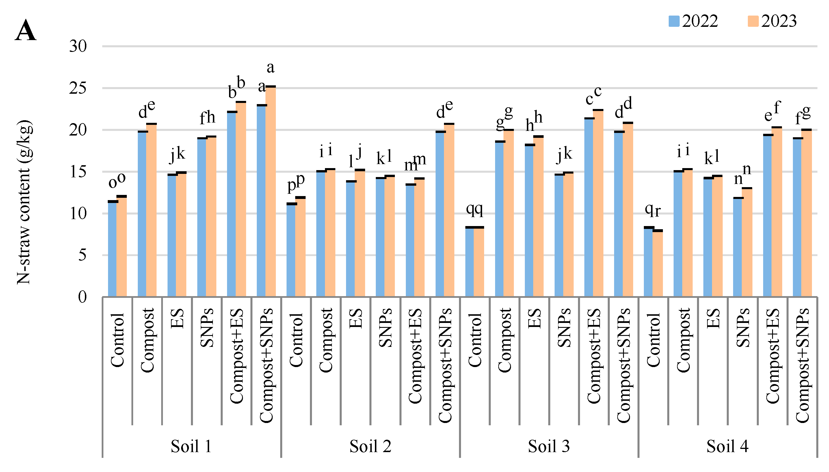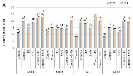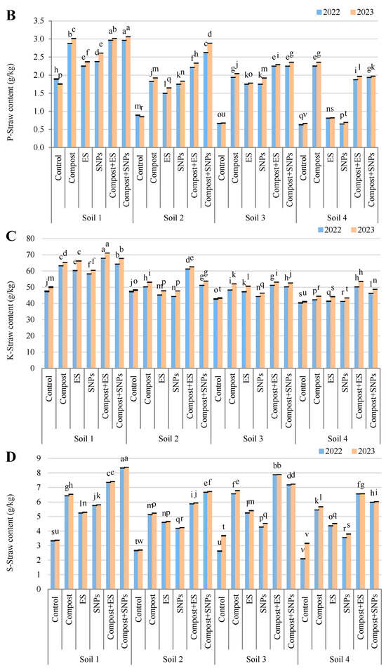 Variation in (A) nitrogen (N), (B) phosphorus (P), (C) potassium (K), and (D) sulfur (S) contents in straw of maize plants (Zea mays L., cv Sakha 168) grown across different salinity levels—Soil 1 (EC = 3.68 dS/m), Soil 2 (EC = 6.15 dS/m), Soil 3 (EC = 8.34 dS/m), Soil 4 (EC = 12.18 dS/m)—and treated with different soil amendments (compost, elemental sulfur (ES), sulfur nanoparticles (SNPs), and their combinations) in two consecutive seasons (2022 and 2023). Different letters on bars are significant according to the Tukey’s test at p ≤ 0.05. Data are means ± SD. n = 3.