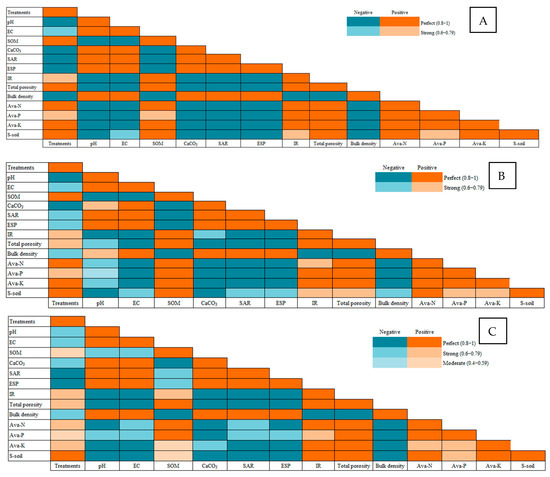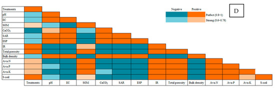 Pearson’s correlation between different salinity levels—(A) Soil 1 (EC = 3.68 dS/m), (B) Soil 2 (EC = 6.15 dS/m), (C) Soil 3 (EC = 8.34 dS/m), and (D) Soil 4 (EC = 12.18 dS/m) —and soil physicochemical parameters during two consecutive growing seasons of maize plants treated with different soil amendments (compost, elemental sulfur, sulfur nanoparticles, and their combinations).